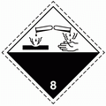 Символ (жидкости, выливающиеся из двух пробирок и поражающие руку или металл) — черный. Фон — верхняя половина белая, нижняя — черная с белой каймой. Цифра «8» белая в нижнем углу.